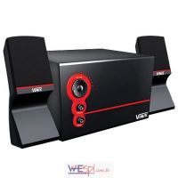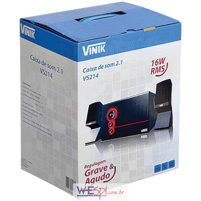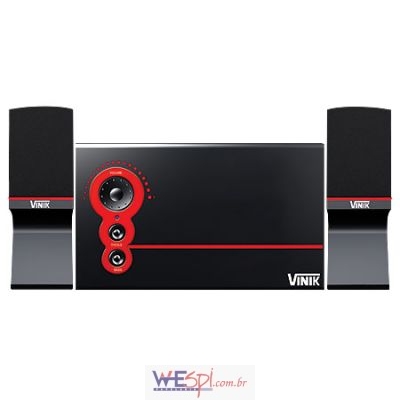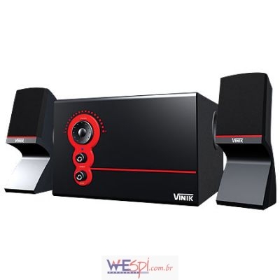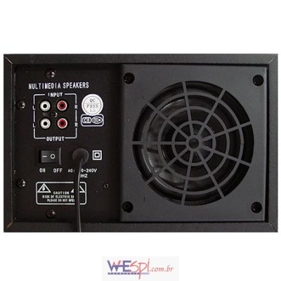 Caixa de som 2.1, compatível com sistemas de áudio e vídeo.